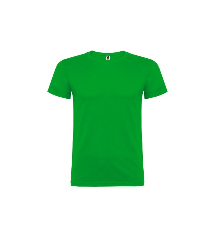 Camiseta de manga corta, de cuello redondo doble con elastano, confeccionada en tejido tubular en tallas de adulto, y con costuras laterales en tallas de niño, con cubrecosturas reforzado en cuello.
