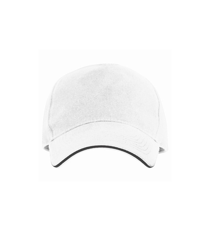 Gorra de 5 paneles con sándwich a contraste. 6 líneas de pespunte en visera. Cuatro agujeros de ventilación. Cinta interior antisudoral. Cierre de velcro.