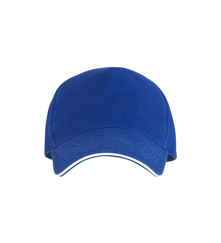 Gorra de 5 paneles con sándwich a contraste. 6 líneas de pespunte en visera. Cuatro agujeros de ventilación. Cinta interior antisudoral. Cierre de velcro.