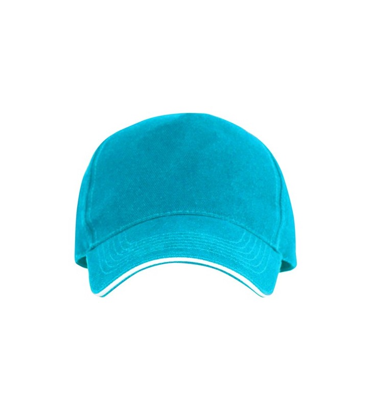 Gorra de 5 paneles con sándwich a contraste. 6 líneas de pespunte en visera. Cuatro agujeros de ventilación. Cinta interior antisudoral. Cierre de velcro.