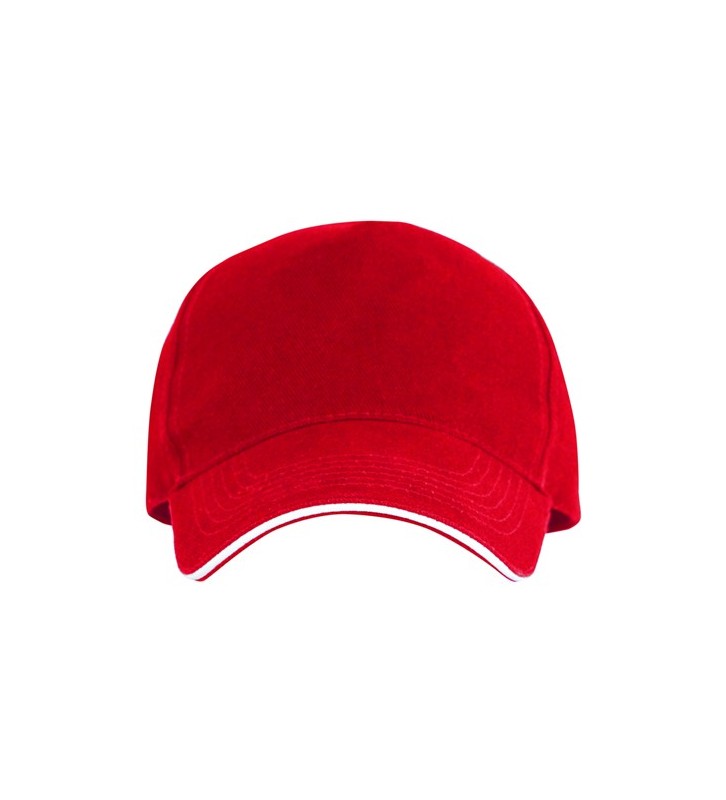 Gorra de 5 paneles con sándwich a contraste. 6 líneas de pespunte en visera. Cuatro agujeros de ventilación. Cinta interior antisudoral. Cierre de velcro.