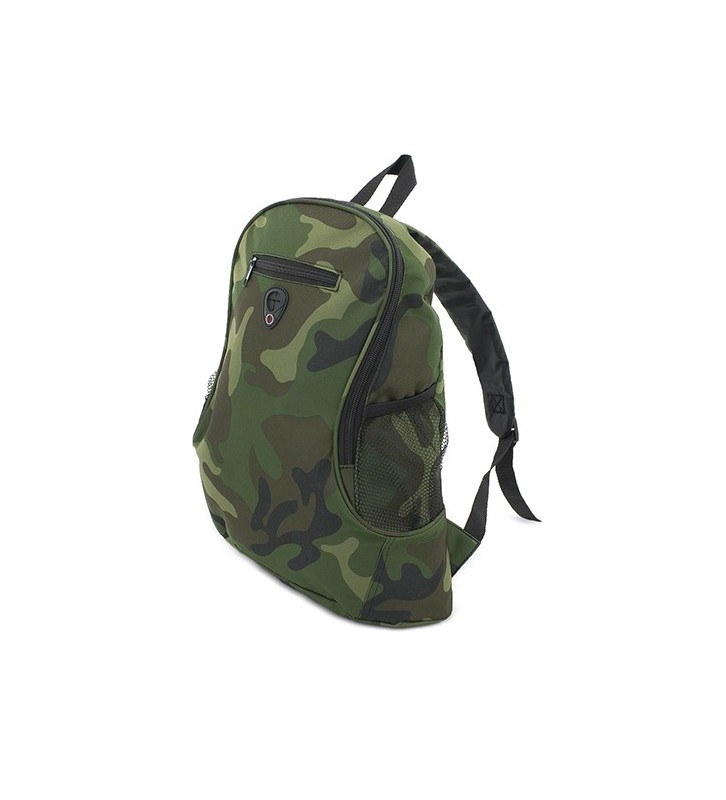 Mochila tejido poliester con dos bolsillos laterales, un compartimento y salida de auriculares.