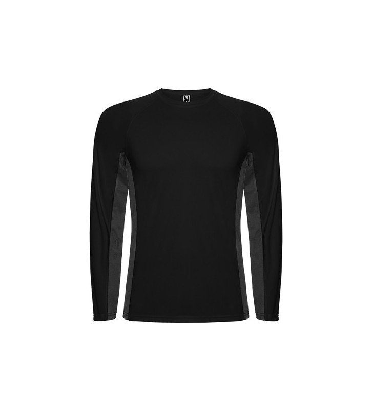 Camiseta técnica combinada, con dos tejidos de poliéster. Manga larga de estilo ranglán.