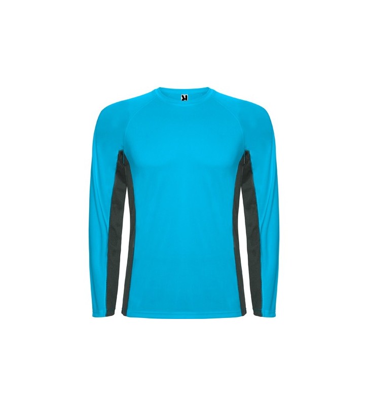 Camiseta técnica combinada, con dos tejidos de poliéster. Manga larga de estilo ranglán.