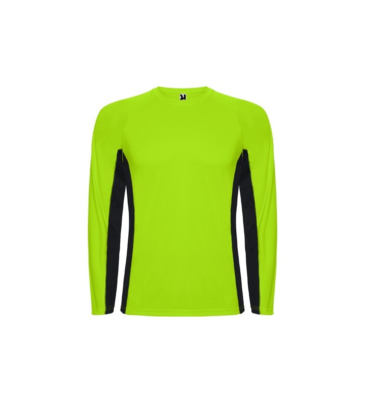 Camiseta técnica combinada, con dos tejidos de poliéster. Manga larga de estilo ranglán.