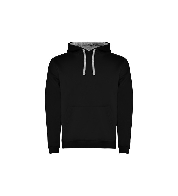Sudadera con capucha bicolor de doble tejido, con cordón contrastado ajustable, cubrecosturas en el cuello y bolsillo canguro.