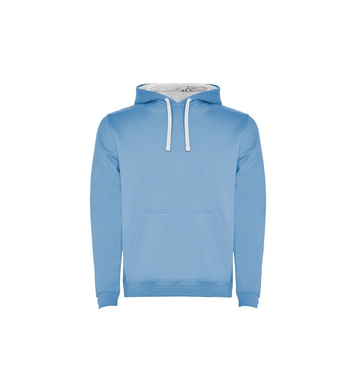 Sudadera con capucha bicolor de doble tejido, con cordón contrastado ajustable, cubrecosturas en el cuello y bolsillo canguro.