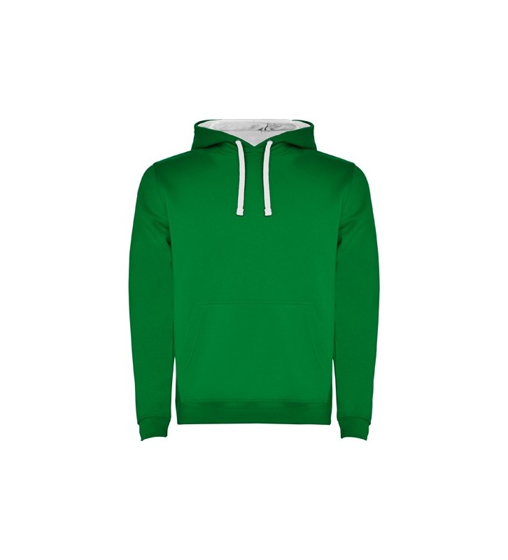 Sudadera con capucha bicolor de doble tejido, con cordón contrastado ajustable, cubrecosturas en el cuello y bolsillo canguro.