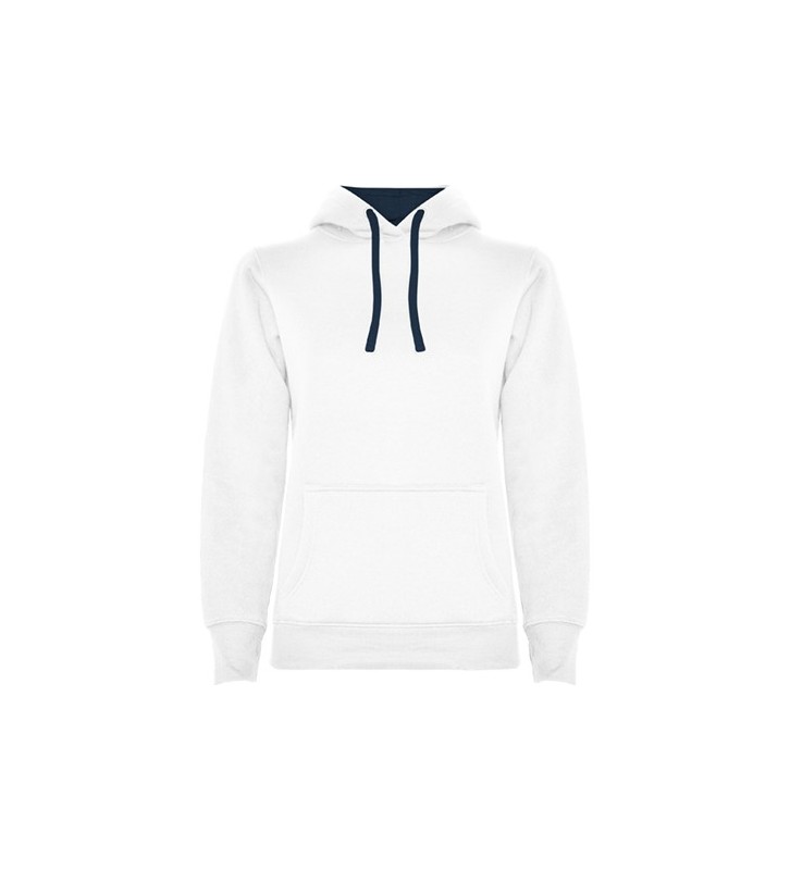 Sudadera entallada de corte femenino con capucha bicolor de doble tejido, con cordón contrastado ajustable.