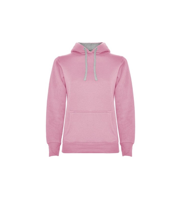 Sudadera entallada de corte femenino con capucha bicolor de doble tejido, con cordón contrastado ajustable.
