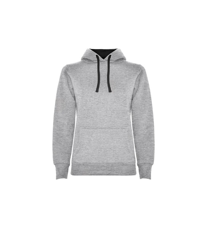 Sudadera entallada de corte femenino con capucha bicolor de doble tejido, con cordón contrastado ajustable.