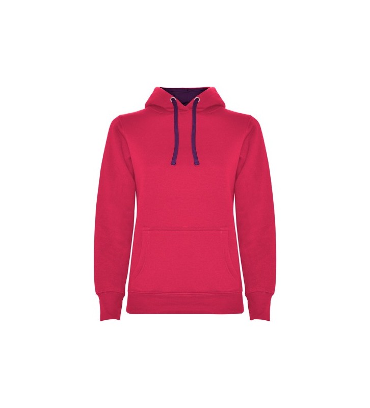 Sudadera entallada de corte femenino con capucha bicolor de doble tejido, con cordón contrastado ajustable.