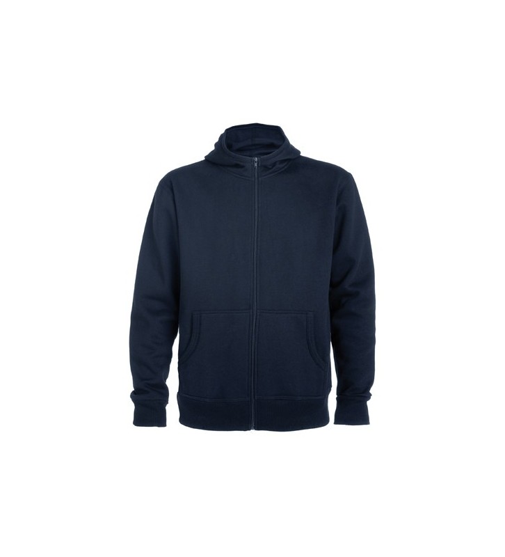 Sudadera con capucha, cuello alto y cremallera completa.